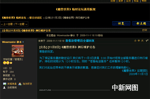 記者登陸《魔獸世界》中文官網(wǎng)臨時論壇發(fā)現(xiàn),網(wǎng)易已于昨晚發(fā)布《魔獸世界》例行維護公告,公告稱,為了保證服務器的穩(wěn)定運行,將于11月3日凌晨 3:00 開始對現(xiàn)有全部服務器進行例行維護,停機時間預計為12小時左右。同時“客服電話服務”也將暫停12小時。