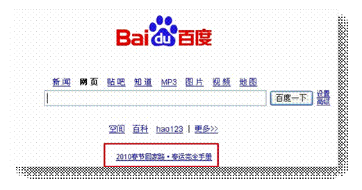 2月3日零點,百度、去哪兒網聯合制作的“2010春節(jié)回家路•春運完全手冊”專題上線發(fā)布,同時專題入口被放置在最引人注目的百度網站首頁。這是繼2009年“英特爾·影響明天的是誰?”專題后,百度2010年第一次啟用首頁資源的重大動作。