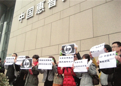 當(dāng)天上午10點(diǎn)半左右,在國(guó)貿(mào)橋東南角的中國(guó)惠普大廈門前,十余名消費(fèi)者手舉自制的紙牌抗議,引來路人圍觀。紙牌上寫著“蟑螂無罪惠普可恥”、“HP,中國(guó)最受鄙視企業(yè)”、“惠普之道,以狡辯應(yīng)萬(wàn)變”等口號(hào)。抗議進(jìn)行了10分鐘左右,消費(fèi)者來到中國(guó)惠普大廈的8層,看到“惠普解決方案體驗(yàn)中心”的招牌后,消費(fèi)者又舉起紙牌進(jìn)行抗議,并要求與售后總監(jiān)談判。11點(diǎn)左右,惠普售后總監(jiān)陳女士來到現(xiàn)場(chǎng)。