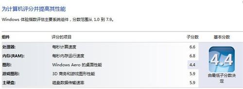 基礎(chǔ)性能測(cè)試,我們來(lái)看一下預(yù)裝的32位版windows7 Home Basic操作系統(tǒng)給出的分?jǐn)?shù)。體驗(yàn)索引結(jié)果為,處理器6.6分,內(nèi)存6.8分,圖形和游戲圖形兩項(xiàng)分別為4.4分和5.9分,硬盤(pán)為5.9分,得分超過(guò)主流中端商務(wù)筆記本。