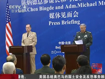 解放軍總參謀長陳炳德上將11日上午與來訪的美軍參聯(lián)會主席邁克爾•馬倫海軍上將舉行會談后,共同會見了中外記者。陳炳德指出……