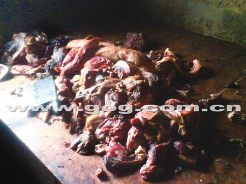 記者昨日(1月13日)在現(xiàn)場(chǎng)看到,一間不大的瓦房?jī)?nèi)掛滿了熏制好的臘肉,約有百余條,地上還有很多松枝燃燒后剩下的灰燼,此臘肉外觀的顏色和市場(chǎng)上所賣的正規(guī)臘肉差不多,但仔細(xì)辨認(rèn)會(huì)發(fā)現(xiàn)其還有很多豬毛沒有完全剃掉。緊挨著該加工房的是一間大一點(diǎn)的屋子,其為初加工房,剛走近該屋記者立刻聞到一股酸臭味,制作臘肉的原材料隨意的丟棄在水泥地上,而且部分豬肉已經(jīng)變色發(fā)臭。該屋里還擺放有幾個(gè)盆和大桶,里面存放的黑色液體估計(jì)是用來(lái)腌泡臘肉的醬汁。