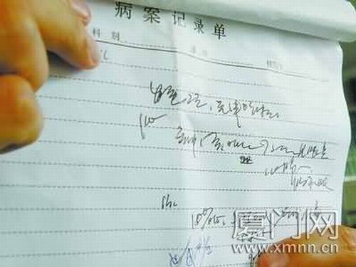 1日下午,在市內(nèi)某大醫(yī)院的兒科候診區(qū),記者隨手向一名帶孩子前來復(fù)診的家長(zhǎng)借了份病歷,一看就懵了:除了“09.2.1”的日期和表示藥物劑量的幾個(gè)阿拉伯?dāng)?shù)字能看清,其他字跡根本無法辨認(rèn)!搬t(yī)生寫字都是這樣!边@位家長(zhǎng)說,他從來就不去看病歷,看了也看不懂。