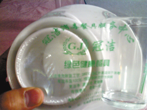 這兩家產(chǎn)品一個名叫“冠潔”,一個名叫“天康”。飯店老板告訴記者,名為“冠潔”的餐具是最近才進(jìn)入市場的,而名叫“天康”的餐具則已經(jīng)有了一段時間!肮跐嵅途叩睦习迨俏覀兊V區(qū)衛(wèi)生局長的丈夫,他親自登門推銷,我們也不敢說什么,只好用一些!
