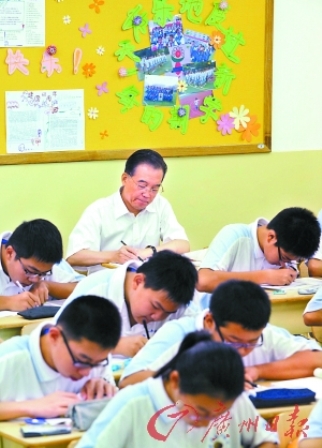 昨天,各大媒體刊登了溫總理與學(xué)生一起上課、共慶教師節(jié)的溫馨圖片。然而,細(xì)心人發(fā)現(xiàn),圖中六個學(xué)生居然有五個是“小眼鏡”,而且清一色地扭著身子趴在桌上寫字,還不如身邊67歲的老人坐得端正!坐在溫總理前面的那位男生幾乎是把眼睛頂在筆桿上,眼睛離作業(yè)本不足10厘米。