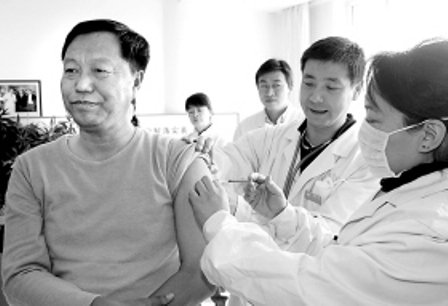 長(zhǎng)春市自10月20日開(kāi)始接種甲型流感疫苗以來(lái),國(guó)家撥給長(zhǎng)春市的13萬(wàn)余人份疫苗只接種了72000余人份。第一批疫苗接種率不到60%,一個(gè)很重要的原因就是有的市民還心存顧慮。為了消除市民的顧慮,昨日上午,長(zhǎng)春市市長(zhǎng)崔杰等市領(lǐng)導(dǎo)接種了甲流疫苗,在場(chǎng)的媒體記者也進(jìn)行了接種。