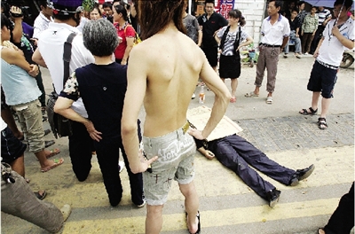 下午1時30分,記者趕到事發(fā)的樹木嶺路和香樟路交會處,一男子趴在地上,他滿頭汗水,嘴唇發(fā)青,一只鞋子脫落一旁,一動不動。他就是王建才。丈夫突然離去,妻子賀建英怎么也不能接受,在一旁呼天搶地,不知所措。