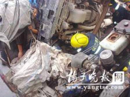 事故發(fā)生后,潤州大隊七里甸消防中隊10名官兵奉命趕往現(xiàn)場救援,潤州交巡警迅速趕到現(xiàn)場指揮疏散交通,很快120急救車也趕至現(xiàn)場。10分鐘后,救援官兵到達(dá)現(xiàn)場,發(fā)現(xiàn)拖拉機(jī)簡易駕駛室已嚴(yán)重變形,被困司機(jī)滿臉血污動彈不得,不住發(fā)出痛苦的呻吟聲。救援指揮員查看了現(xiàn)場情況,發(fā)現(xiàn)救援關(guān)鍵在貨車車頭,只有將壓在拖拉機(jī)上的車頭拉開,才能破拆救援,但要將車頭拉離,必須要動用大型吊車,而且需要一定時間。面對不斷呻吟的被困司機(jī),指揮員當(dāng)即請120急救醫(yī)生為其輸液,以減少司機(jī)的痛楚。