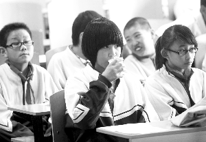 昨天下午2點(diǎn),朝陽(yáng)區(qū)垂楊柳中學(xué)初中部,四間教室分別被臨時(shí)用做“候診室”、“接種室”、“處置室”和“觀察室”。初一年級(jí)的30名學(xué)生每人手里拿著一份經(jīng)家長(zhǎng)簽名的“甲流疫苗接種知情同意書”率先被帶進(jìn)了候診室。