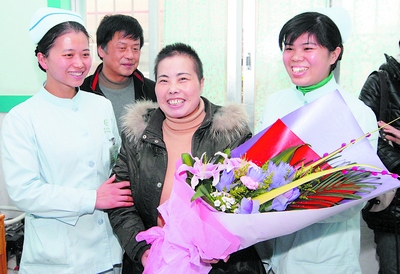 3月2日上午,已將一頭長卷發(fā)剪成寸頭的吳澤連由丈夫陪著坐在病床前的凳子上。此時的她滿面笑容,臉上還帶著一絲紅潤。入院66天來,在眾多親友都認(rèn)為“沒得救了”的情況下,她硬是從“鬼門關(guān)”被拉了回來。