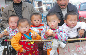 昨日上午,河南鄭密路與淮河路交會(huì)處農(nóng)貿(mào)市場(chǎng)門(mén)口,約一歲半的五胞胎繞著一輛小推車(chē)嬉笑打鬧,吸引路人紛紛駐足。三男二女,名叫貝貝、晶晶、歡歡、迎迎和妮妮,與奧運(yùn)吉祥物五福娃同名。