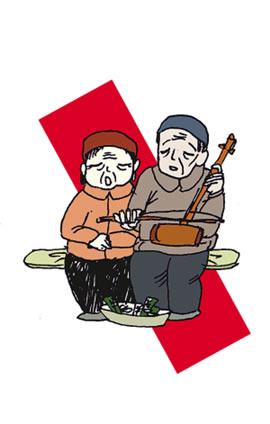 ☆吉利話扭倒費(fèi) 身強(qiáng)體健的中年壯漢也有自己的乞討之道:在開門營業(yè)的攤點(diǎn)前耍獅子、打快板、送財(cái)神,不給錢就不走人,磨到你給錢為止。
