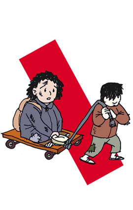 ☆惡人控制弱者 最為惡劣的乞討方式,是健康成年人控制未成年人、殘疾人為其乞討。比如賣花姑娘、賣藝小孩等,多屬此類。為了能撈到更多錢,那些健康的成年人往往讓這些未成年人缺衣少吃,甚至不惜將孩子致殘。