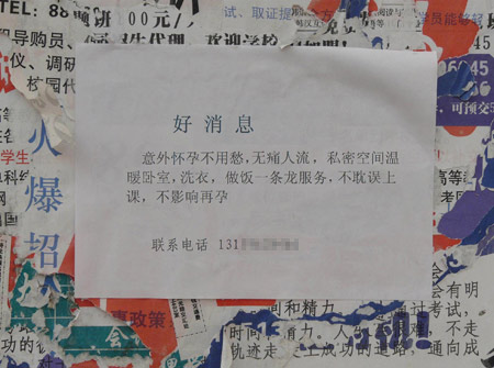 近日記者走進某高校,在一個靠近圍墻的廣告欄上,不起眼的角落里貼著一張小廣告,上面寫著“無痛人流一條龍服務(wù),不影響上課……”