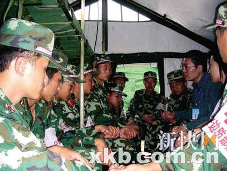 “300名孩子的尸體都堆在學(xué)校。我們就在不遠(yuǎn)處扎營,晚上夢見死去的孩子們?nèi)空酒饋砹顺易哌^來……”戰(zhàn)士小駱流著淚抓住心理救援隊(duì)專家的手訴說著。前日,廣州心理救援隊(duì)來到了廣東公安邊防總隊(duì)某支隊(duì),在帳篷里為115名官兵進(jìn)行心理輔導(dǎo)。“戰(zhàn)士們在救援時(shí)遇到的問題已經(jīng)超過了他們的承受范圍,他們急需心理輔導(dǎo)!焙蛻(zhàn)士們交流之后的胡慎之醫(yī)生表達(dá)了自己的擔(dān)憂。