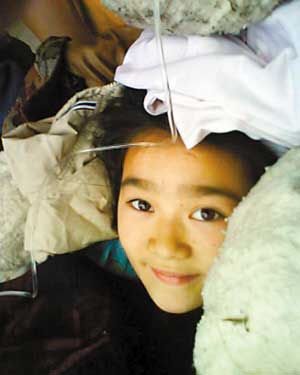 【當(dāng)初】:這個女孩被埋在一片廢墟中,輸液的管子懸在她的頭頂。然而,她那清秀的臉上露出的竟是甜甜的微笑。她叫高瑩,都江堰聚源中學(xué)初三學(xué)生。在廢墟中被埋20個小時后,她被從廢墟中挖出來了,雙腿都斷了,雙手也被砸傷,可她從被挖出來到救助站都沒哭,在大家挪動她的時候,她也只是咬了咬嘴唇。這個女孩還一邊微笑,一邊對大家說:“要勇敢!”