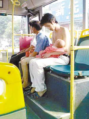 昨天(24日)下午4時(shí)左右,在廣東省東莞36路公交車上,由于車內(nèi)空調(diào)涼爽,患感冒的小女嬰一上車就打起瞌睡,父親阿勇(化名)趕忙脫下襯衣包裹住懷中的女兒。乘客對(duì)赤膊的阿勇贊彈不一,有男乘客認(rèn)為阿勇脫衣裹蓋女兒是父愛的表現(xiàn),無可厚非;有女乘客則認(rèn)為阿勇在公眾場(chǎng)合打赤膊不雅,影響了東莞的城市文明形象。