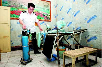 經(jīng)查,該門診部內(nèi)仍存放有大量藥品,一個(gè)小房間內(nèi)放著兩臺婦科檢查床,還有氧氣瓶和吸宮器等物,沒有任何消毒措施,緊鄰的則是一個(gè)簡陋病房,里面有4張病床。就是這個(gè)臟亂的黑診所,門牌居然醒目地標(biāo)著“婦產(chǎn)”、“人流”、“引產(chǎn)”等字樣。