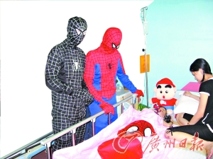 昨日上午9時(shí)30分許,在汕頭大學(xué)第一附屬醫(yī)院北樓三層的兒科病房的走廊上,突然出現(xiàn)了兩個(gè)與周圍環(huán)境不太相襯的角色,立刻引起了一陣不小的轟動(dòng)。“兩個(gè)男的,一個(gè)穿紅衣服,一個(gè)穿黑衣服,都蒙著臉!眱嚎撇》42床上的小患者母親黃海璇回憶當(dāng)時(shí)的情景,這兩個(gè)人的裝扮就和電影里的“蜘蛛俠”一模一樣,徑直來到了她眼前,然后把蜘蛛俠玩具放到了病床上。
