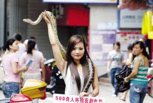 這名自稱叫“優(yōu)優(yōu)”的年輕女子說,她今年22歲,陜西人,曾是專業(yè)舞蹈演員。她從小不怕蛇,3年前自己養(yǎng)起了蛇,剛開始由于缺乏專業(yè)養(yǎng)殖知識,死了好幾條蛇,她為此十分難過,F(xiàn)在她對“蛇性”相當(dāng)了解,還學(xué)起了蛇舞、印度舞、肚皮舞。優(yōu)優(yōu)指指脖子上的蛇稱,這是條緬甸蟒,10多斤重,進(jìn)食胃口很大,不僅要吃豬肉,而且一次能吃七八只和鴿子差不多大小的鳥。由于養(yǎng)蛇,這幾年來優(yōu)優(yōu)一直單獨一人居住,“沒幾個人不怕蛇的,我只能帶著蛇單獨過。”帶蛇來“逛”山西路,優(yōu)優(yōu)另有目的,她背后的胡導(dǎo)稱,他計劃花5年時間搜集500個奇人,拍攝奇人喜劇電影,讓他們展示各自絕技,目前有人愿出數(shù)百萬拍攝。