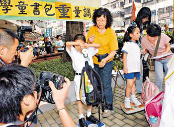 香港學(xué)童書包超重嚴(yán)重,雖然醫(yī)學(xué)界建議書包重量不超過體重10%,但早前民建聯(lián) 一項調(diào)查顯示,香港學(xué)童書包重量平均達(dá)3.9公斤,最重更達(dá)7公斤,其中有一年級學(xué)童書包超重最為嚴(yán)重,平均比標(biāo)準(zhǔn)重量高出近49%。