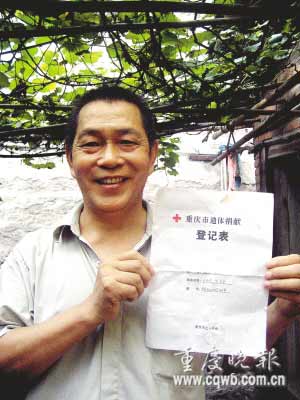 蔣必忠的愿望在7月24日這天變成了現(xiàn)實(shí)。那天下午,當(dāng)他躺在病床上,用顫抖的右手在那張《重慶市遺體捐獻(xiàn)登記表》上歪歪斜斜簽下自己的名字后,他長(zhǎng)長(zhǎng)地舒了口氣。就這樣,這個(gè)59歲的直腸癌晚期患者,成為在北碚區(qū)紅十字會(huì)登記的首個(gè)農(nóng)民遺體捐獻(xiàn)者。
