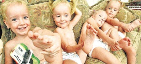 據(jù)紐約大學(xué)醫(yī)學(xué)中心生殖內(nèi)分泌學(xué)部主任克里佛博士稱,“同卵四胞胎”的出生概率不到6400萬分之一,醫(yī)學(xué)文獻顯示,有史記載的同卵四胞胎組合全世界僅有50例(一說44例)?死锓鸩┦空f:“同卵四胞胎的案例,我們在現(xiàn)實生活中幾乎從未聽說過,它就像是大自然在進行自己的克隆實驗一樣。” (陽 沐)