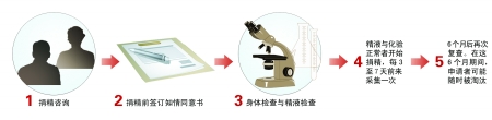 志愿者想來捐獻精液,專業(yè)人員要先和志愿者談心,簡單了解志愿者個人情況,并給志愿者解釋注意事項,之后簽訂“知情同意書”。然后,捐獻者要在捐獻室內(nèi),通過一系列的消毒措施后,通過自慰的方式,采集一定量的精液。初次檢驗,確定精液質(zhì)量尚可的,將進行詳細的體檢、抽血,檢查肝功能、染色體、艾滋病等項目,任何一項不合格,都將被淘汰。所有體檢項目,都是免費的。