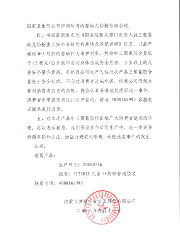 四、根據(jù)最新發(fā)布的《國務院相關(guān)部門負責人就三鹿嬰幼兒奶粉重大安全事故的有關(guān)情況答記者問》信息,以最嚴格的0-6月齡的嬰幼作為保護對象,奶粉中三聚氰胺含量低于15毫克/公斤就不會對身體造成安全危害。三歲以上的兒童安全量會更高。雖然我公司生產(chǎn)的這批次產(chǎn)品三聚氰胺含量低于安全標準,不會對消費者造成危害,但我公司仍然本著對消費者負責的態(tài)度,將會認真妥善地處理好這一事件。消費者手里若還有這批次產(chǎn)品的,請與4008169999客服電話聯(lián)系進行退貨。