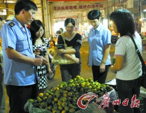 三水工商局在接到閔小姐情況反映后,立即派出工作人員及市場管理人員到該水果檔進行調查,并由市場管理人員將該水果檔正在出售的一堆橘子拿到農業(yè)部門送檢,等待檢驗結果再作進一步處理。