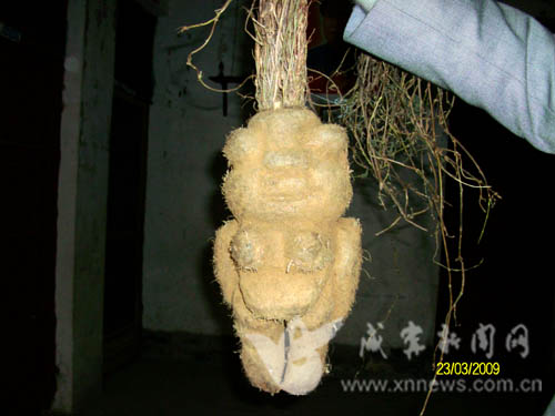 3月21日,在通城縣北港鎮(zhèn)莊前村的杭瑞高速建設(shè)工地,施工時(shí)挖出一個(gè)特大的何首烏。何首烏長相似一女性,雙眼突出,鼻口明顯,雙耳高聳,雙手雙腳如立正姿式,胸圍約40公分,身高35公分,重3600克。