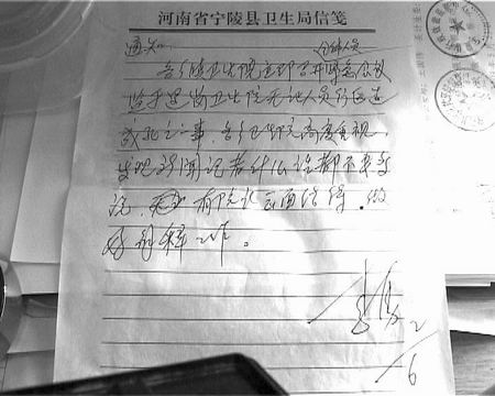 “寧陵縣邏崗鎮(zhèn)衛(wèi)生院沒有行醫(yī)資格的醫(yī)生給我兒媳接生,導致胎死腹中!6月1日,商丘市民權(quán)縣伯黨鄉(xiāng)村民郭漢章打來熱線反映。而記者在采訪中,卻意外地發(fā)現(xiàn)一份該縣衛(wèi)生局長簽名的通知,要求:“各鄉(xiāng)衛(wèi)生院高度重視,發(fā)現(xiàn)新聞記者,什么話都不要多說……”(如左圖)據(jù)郭漢章介紹,5月1日傍晚,兒媳趙婭君感到腹部陣痛,家人立即將其送入寧陵縣邏崗鎮(zhèn)衛(wèi)生院檢查!爱斖碜鯞超檢查時,醫(yī)生說胎音、羊水一切正常。第二天早上6點,醫(yī)生王美英叫來一個人,一起將兒媳送進產(chǎn)房后,兩個人不停地在兒媳腹部擠壓,一個半小時后,趙婭君全身顫抖,面色異常。做了檢查后,證實其腹中胎兒已經(jīng)死亡。”