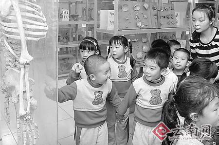 當(dāng)學(xué)校的大巴車開(kāi)進(jìn)昆醫(yī)時(shí),幼兒園的孩子們紛紛透過(guò)車窗好奇地打量著校園,從列隊(duì)到進(jìn)入標(biāo)本陳列室,他們特有的嘰嘰喳喳打破了原有的寧?kù)o。
