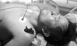 在同仁醫(yī)院急診室,記者見到了受傷的民工。他躺在病床上動(dòng)彈不得,兩邊耳廓后面還在流血,左邊肩部,一根比拇指還粗的螺紋鋼筋,從腋下一直穿到肩部,肩膀外面露出一寸多長(zhǎng)的鋼筋頭。鋼筋還被一層布包著,那是民工的衣服,鋼筋戳到他時(shí),衣服也被一起戳進(jìn)了肉里。