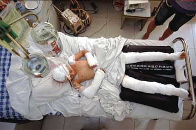 四肢纏著繃帶的小月躺在病床上。 記者王磊/攝