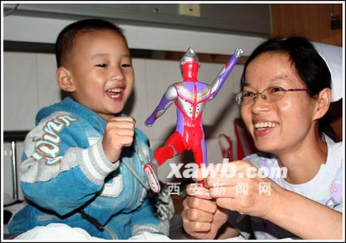圖為手術(shù)前醫(yī)護(hù)人員在逗郎錚開(kāi)心。