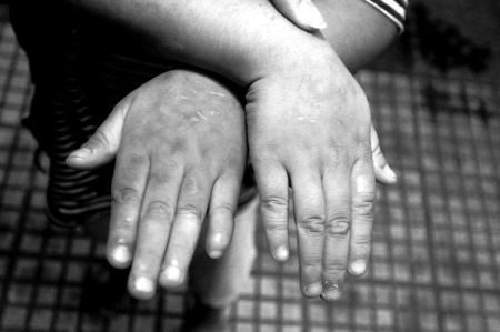 雖然院子里的孩子很多,但一眼就能認(rèn)出玲玲,身材瘦小,臉上、耳后都是傷疤,雙眼腫脹,撩開右臂衣袖,可以發(fā)現(xiàn)3塊醒目的大傷疤。玲玲遲疑了一下說:“是爸爸用燒熱的打火機(jī)燙的!
