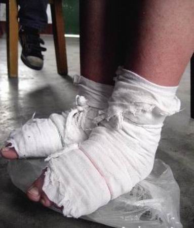那個姐姐的死讓黃小紅開始特別注意清潔。每天早上,她都會先用消過毒、又浸滿氯化鈉生理鹽水的紗布將女兒一雙小腳裹起來,然后背著她,或用自行車載著她來到學(xué)校,再將冰袋放到女兒課桌下,讓她踩在冰袋上上課。中午回家后,又給她重新?lián)Q紗布。下午放學(xué)后,又給女兒雙腳消毒。