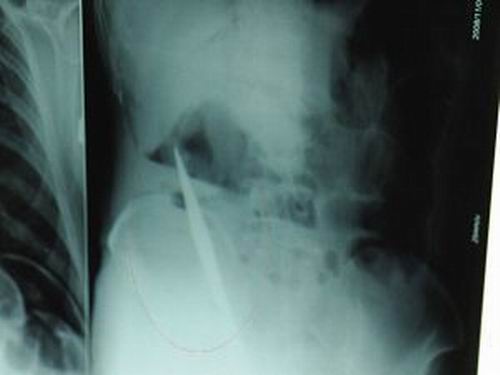 昨天(11月6日)上午,記者在徐州礦務(wù)集團(tuán)總醫(yī)院重癥監(jiān)護(hù)室見(jiàn)到了這名男子,目前他雖然已經(jīng)恢復(fù)了意識(shí),但還不能開(kāi)口說(shuō)話,需要呼吸機(jī)輔助呼吸。據(jù)醫(yī)生介紹,4日中午12時(shí)左右,這名男子因服毒輕生被緊急送到醫(yī)院進(jìn)行搶救,之前,這名男子已經(jīng)在當(dāng)?shù)剜l(xiāng)鎮(zhèn)醫(yī)院進(jìn)行了近20小時(shí)的治療,但效果不佳!安∪吮晦D(zhuǎn)院到礦總院時(shí)已神志不清,血壓極低,處于休克狀態(tài)!本茸o(hù)人員給男子洗胃、初步處理以后,發(fā)現(xiàn)男子呼吸急促,于是趕緊給他拍片檢查。結(jié)果讓所有的醫(yī)生大吃一驚,竟有一把尖狀異物橫在該男子腹腔內(nèi)!當(dāng)天下午5時(shí)30分,輕生男子被推上了手術(shù)臺(tái)。經(jīng)過(guò)40多分鐘的手術(shù),該男子腹腔被打開(kāi),手術(shù)醫(yī)生發(fā)現(xiàn),男子體內(nèi)的金屬狀異物竟然是一把長(zhǎng)19厘米的尖刀!