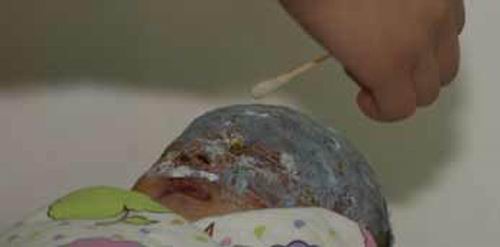 記者昨天(1月3日)在醫(yī)院見到了孩子,醫(yī)生把藥膏從孩子頭頂敷到孩子嘴唇上方,白白的一大片。孩子出現(xiàn)高燒,“醫(yī)生說要過了7天感染期,才能知道孩子傷到啥程度,能不能留下疤痕!睏畹ふf。