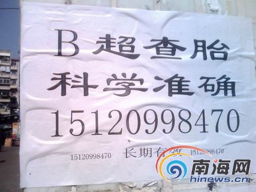 “只要你愿意花800元,肚子里懷的是男是女,一查便知!”連日來在?诘拇蠼中∠飪(nèi),出現(xiàn)了很多類似的廣告。那么,這一明顯違反國家規(guī)定的行為究竟是怎么回事呢?1月13日至1月14日,記者連續(xù)兩天進(jìn)行暗訪,一探究竟。