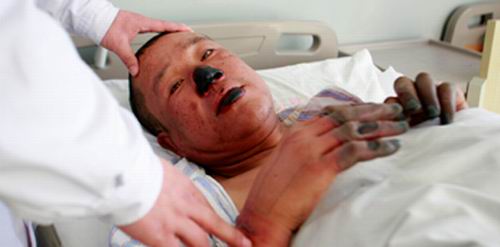 昨日(1月14日),記者在省武警醫(yī)院見(jiàn)到尹某,心頭不禁一震。尹某面部被嚴(yán)重凍傷,均已腫脹,鼻子和下唇均壞死,變成黑色,手和腳用紗布包著,看到黑色的指頭。