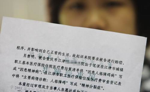 昨日,小玫趕到重慶向記者出示了調(diào)解書。法院查明,當(dāng)初醫(yī)院在小玫醫(yī)保住院醫(yī)療費結(jié)算清單中將“因患人格障礙病”寫成“因患精神病”和在“職工醫(yī)保費用審查登記表”病情診斷一欄中將“人格障礙”寫成了“精神分裂癥”,都是筆誤。經(jīng)過調(diào)解,醫(yī)院愿意將上述兩處“筆誤”改過來,即把精神病的鑒定刪去,不過依然保留對患者有“人格障礙”的結(jié)論。小玫說作為調(diào)解的條件,她放棄了6萬元的索賠請求。
