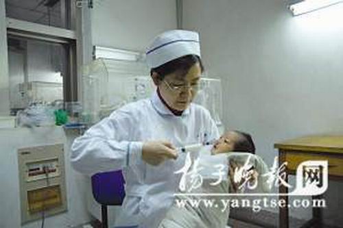 4日上午,記者來(lái)到儀征市人民醫(yī)院婦產(chǎn)科,只見(jiàn)朱汝成護(hù)士長(zhǎng)正在用針管小心翼翼地給“小牛娃”喂奶。由于小家伙鼻腔和口腔相通,不能自己喝奶,每次只能用針管,還要小心謹(jǐn)慎,生怕嗆著孩子。記者注意到,“小牛娃”用依戀的眼神看著護(hù)士長(zhǎng),朱護(hù)士長(zhǎng)說(shuō),每次看見(jiàn)小孩子的眼神,心里特別難過(guò),自己也是母親,知道這么個(gè)小生命實(shí)在太脆弱了,F(xiàn)在自己照顧他,就把他當(dāng)成自己的孩子,孩子是無(wú)辜的,他也是一個(gè)小生命。“小牛娃”吃完奶后,朱護(hù)士長(zhǎng)又把他放進(jìn)幼兒床里,因?yàn)榕滦〖一镏鴽,辦公室的空調(diào)始終開(kāi)著,從正月初三起,婦產(chǎn)科全體醫(yī)護(hù)人員輪流照顧孩子,并給孩子購(gòu)買(mǎi)奶粉、衣服、尿不濕等必需品。