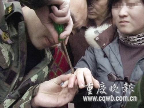“用肥皂水潤滑手指!”中隊長朱曉釗提出建議。無奈,楊虹指關(guān)節(jié)腫起老高,戒指進(jìn)退兩難……20分鐘過去,楊虹無名指指關(guān)節(jié)越發(fā)紅腫,手指淤血漸漸擴(kuò)散,由烏變紫。為保手指,楊虹及家人同意破拆指環(huán),取下婚戒。
