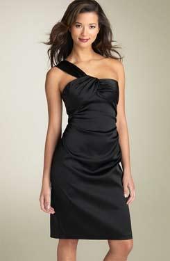 單肩——不對稱的美麗!配上胸部輕描淡寫般的皺褶,無需更多修飾就很完美的一條小黑裙,但不適合肩膀?qū)挼呐恕?/p>