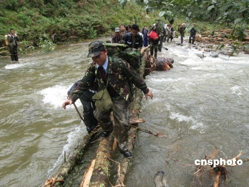 圖為救援人員穿越哀牢山原始森林無(wú)人區(qū)。途中多處河流需淌水而過,河水冰冷刺骨。中新社發(fā) 劉子倩 攝