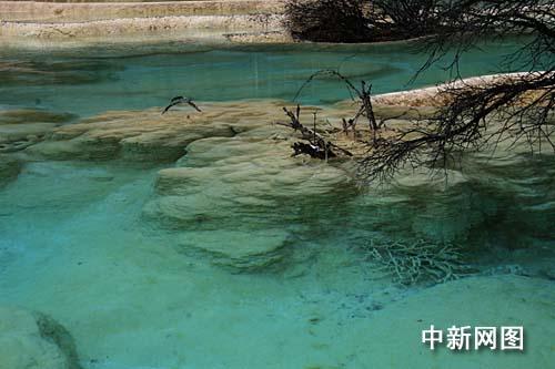 整個山谷幾乎全被乳黃色的碳酸鈣質覆蓋,從高處看去,宛若一條從岷山雪峰飛騰而下的黃龍,景區(qū)由此得名。一層層的碳酸鈣形成層層疊疊的梯狀湖泊、池沼,水色因水底沉積物和山色的千變萬化,而呈黃、綠、淺藍、蔚藍等顏色,是名副其實的“人間瑤池”。