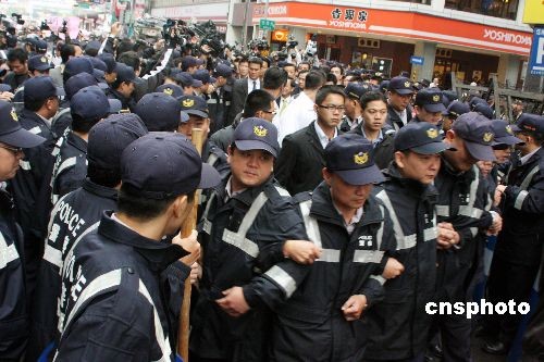 陳水扁從其辦公室步行前往不足百米遠(yuǎn)的特偵組,眾多警察在其周圍維持秩序,現(xiàn)場(chǎng)附近警方部署大批警力。中新社發(fā) 黃少華 攝