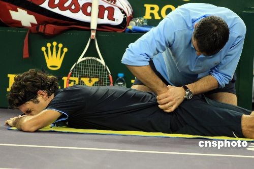 圖為比賽間隙費(fèi)德勒在場(chǎng)邊療傷。中新社發(fā) 湯彥俊 攝